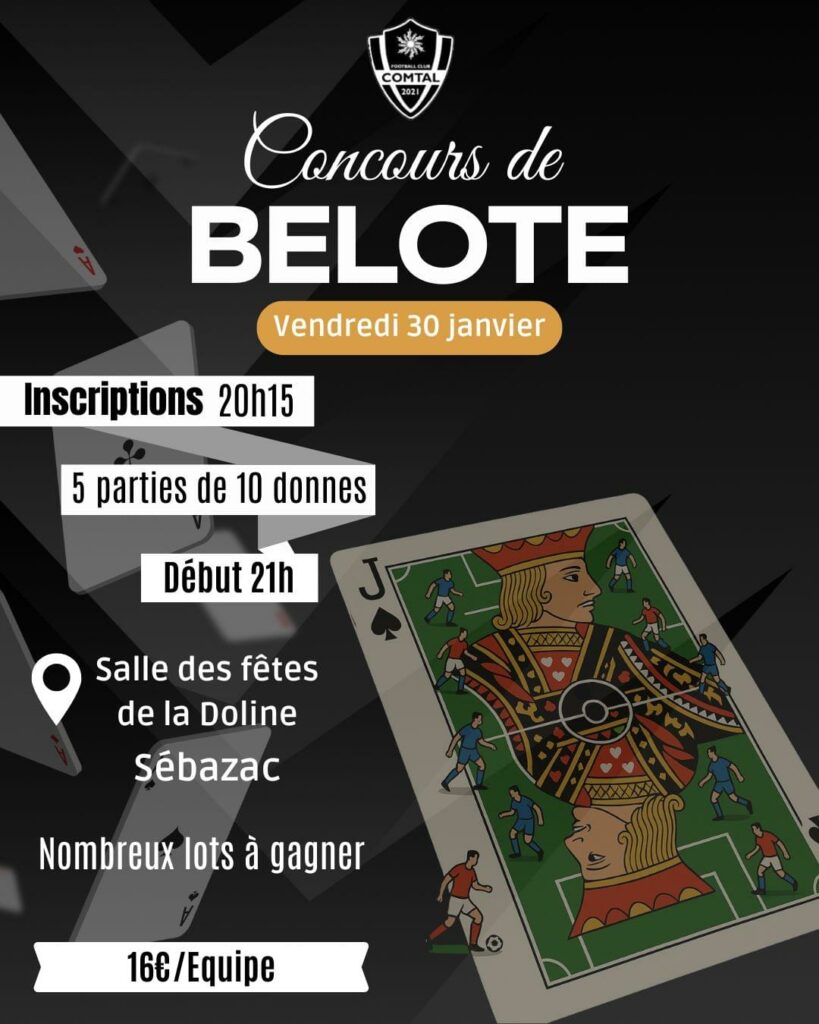 Concours de Belote vendredi 30 janvier à Sébazac Concours de Belote du F.C. Comtal Vendredi 30 janvier 2026 21h00 – Début des parties Salle des fêtes de la Doline à Sébazac Un moment convivial, ouvert à tous (licenciés, familles, amis, supporters, …) pour passer une bonne soirée dans la bonne humeur Inscriptions sur place dès Lire la suite →
