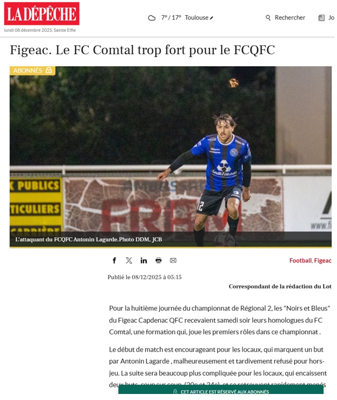 Article LDDM du 8 décembre 2025 : « Figeac. Le FC Comtal trop fort pour le FCQFC