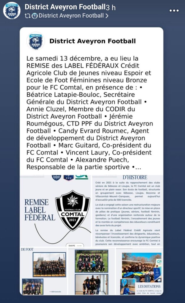 Article sur site internet et réseau sociaux du District Aveyron Football sur la remise du Label Ecole de Foot: