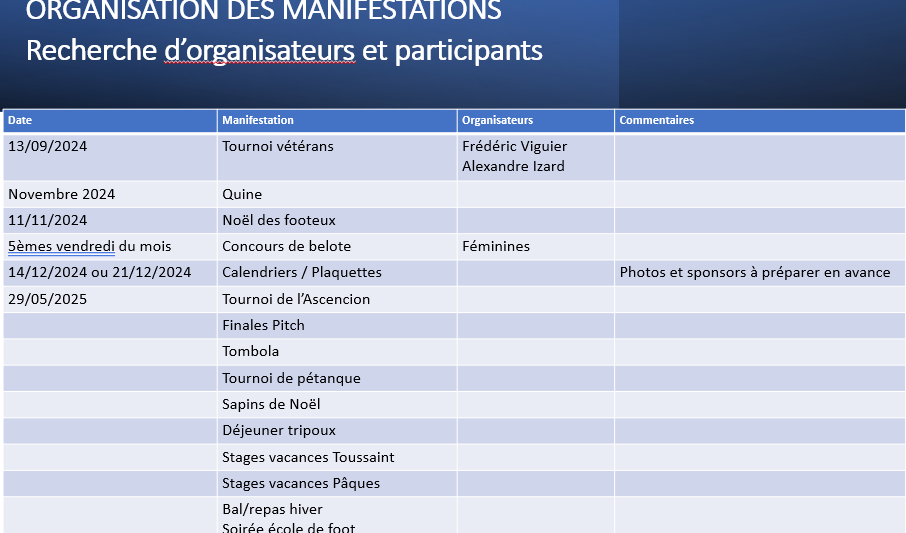 Équipements Équipes féminines Équipes masculines École de foot Tournoi jeunes (Ascension) Tournoi vétérans Quine Calendriers/plaquettes Tombola commerces Soirée de Noël Sapins de Noël